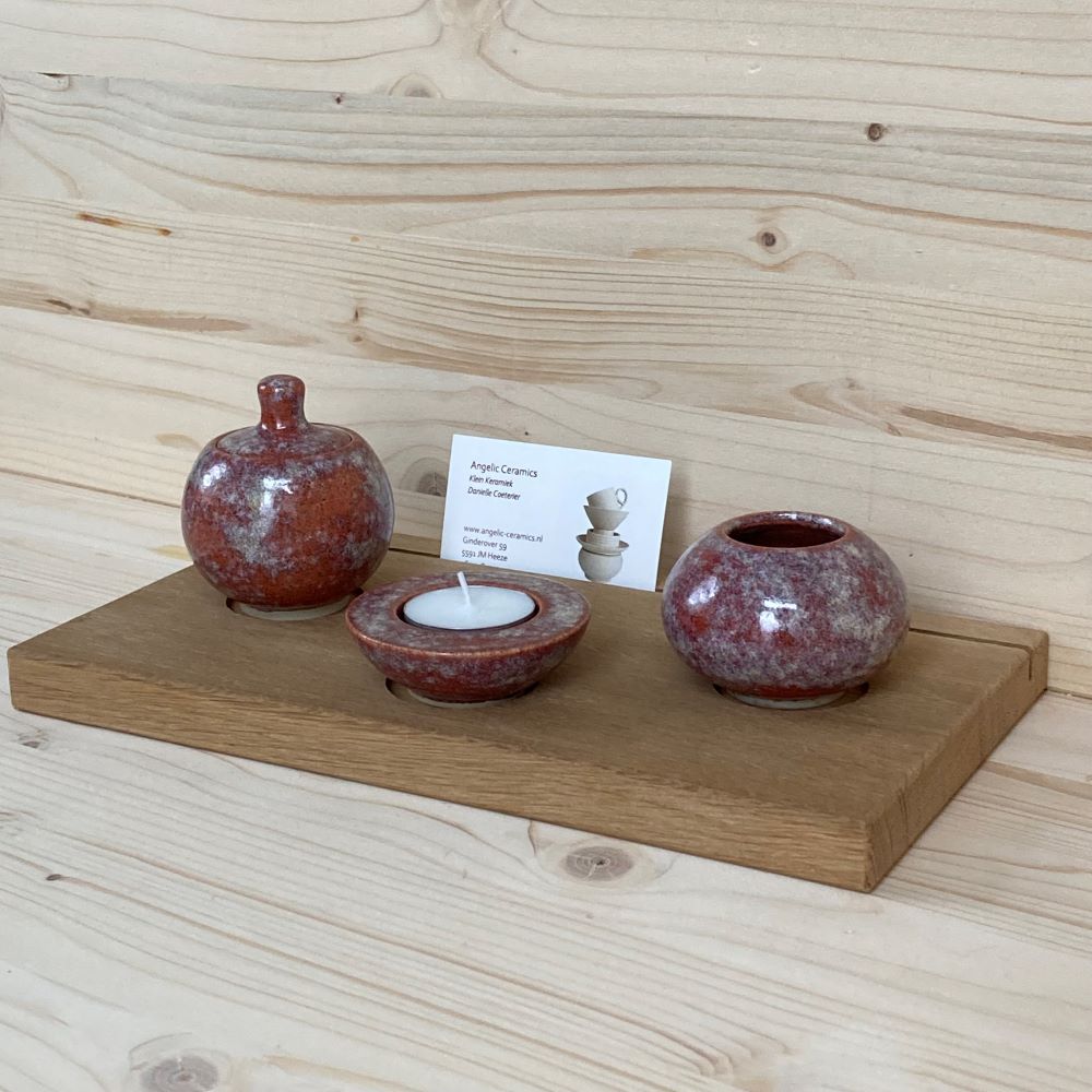 Een bloemenvaasje, een kaarsje en een klein aspotje vormen samen op een eikenhouten plankje een gedenksetje. Achter het setje bevindt zich een smalle sleuf over de hele breedte van het plankje voor een rouwkaart of een foto. Dit setje is met liefde gemaakt en met verse bloemen en een kaarsje bewaar je elke dag je herinneringen aan die speciale geliefde.