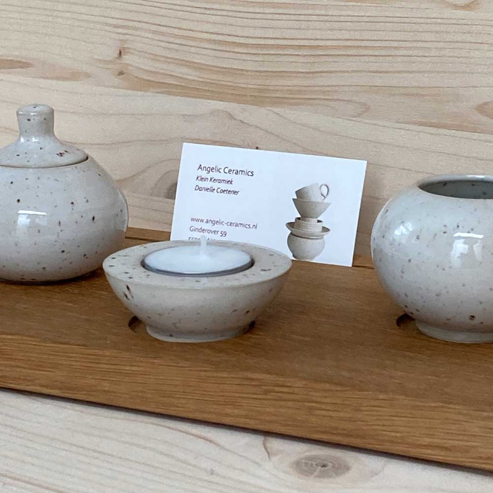 Een bloemenvaasje, een kaarsje en een klein aspotje vormen samen op een eikenhouten plankje een gedenksetje. Achter het setje bevindt zich een smalle sleuf over de hele breedte van het plankje voor een rouwkaart of een foto. Dit setje is met liefde gemaakt en met verse bloemen en een kaarsje bewaar je elke dag je herinneringen aan die speciale geliefde.