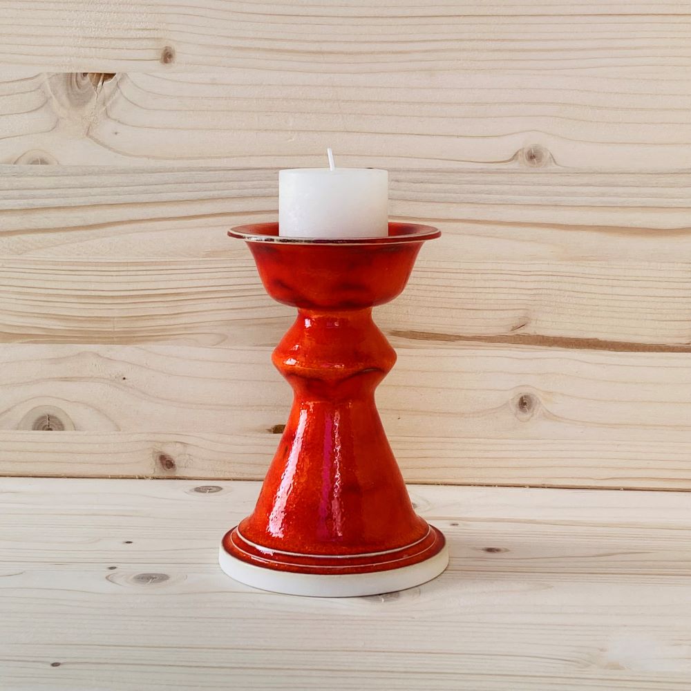 Deze robuuste kandelaar met het opvallende oranje rode glazuur is een absolute topper. Heel mooi als warm aandachtspunt in een klassiek interieur, maar ook een coole blikvanger in een modern interieur.